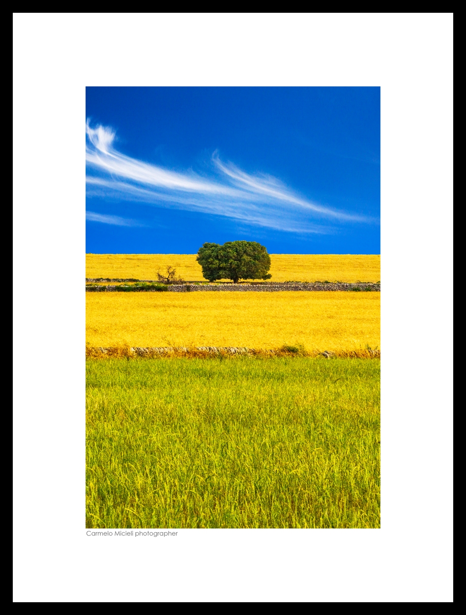 I campi dorati si distendono come un mare di luce sotto un cielo d’un blu profondo, mentre un carrubo si erge al centro, custode di un paesaggio eterno. Le linee orizzontali nette creano un ritmo visivo che calma lo sguardo, e la nuvola sottile che danza sopra l’albero sembra un soffio d’anima, un pensiero che si dissolve nell’infinito. È un’immagine che parla di solitudine armoniosa, di tempo sospeso, e dell’intimo dialogo tra terra e cielo